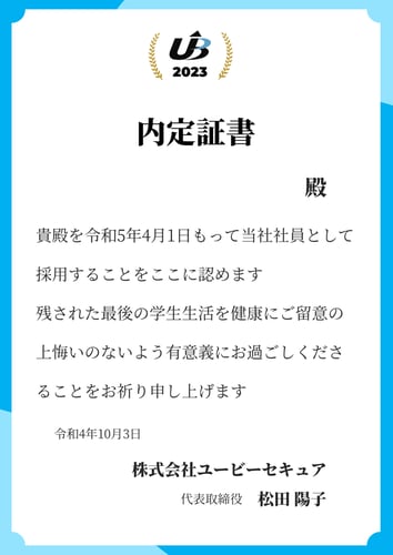 一生に一度の内定式なので、記念になるようにと毎年オリジナルの内定証書を作成してお渡ししています。