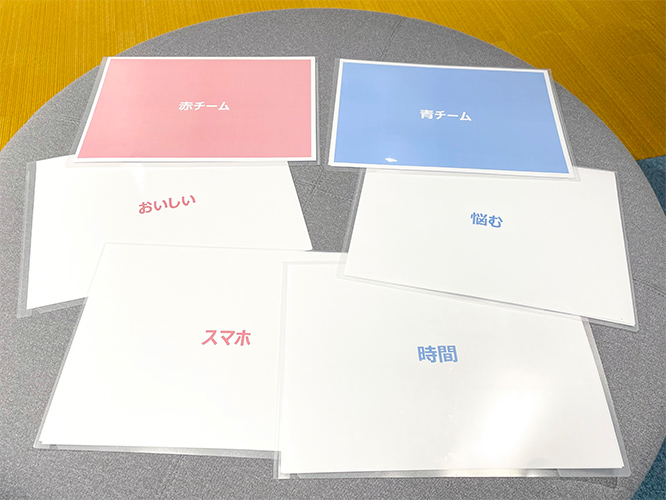 ユービーセキュアの「部活道」の1つ、ゲーム部からお借りしました。ゲームは2種類。1つは「穀物取引」がテーマのボードゲームで、ベルを鳴らしながら手札の交換を宣言し合うスピード感のあるゲームでした。2つ目は、「究極の選択」を作成し、みんなで回答し合うゲームで、みんなの意外な一面を知ることができるユニークなゲームでした。