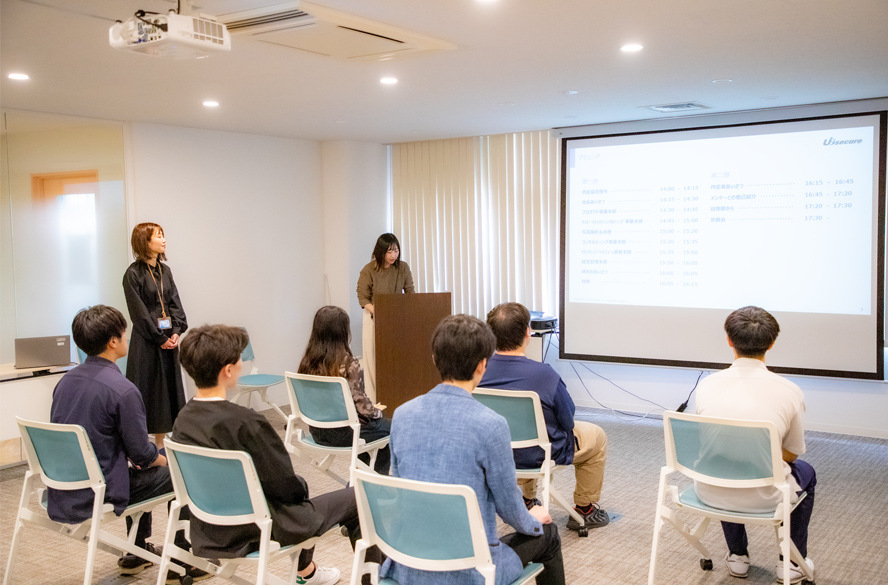 メンターとは、入社前から入社後の研修期間、各部署への配属までの間、新入社員をフォローする先輩社員のことです。ユービーセキュアでは、新入社員一人につき一人ずつ専属のメンターがつきます。会社や仕事についての不安や困りごとがあればいつでも相談してもらえるよう、定期的にコミュニケーションを取っていきます。