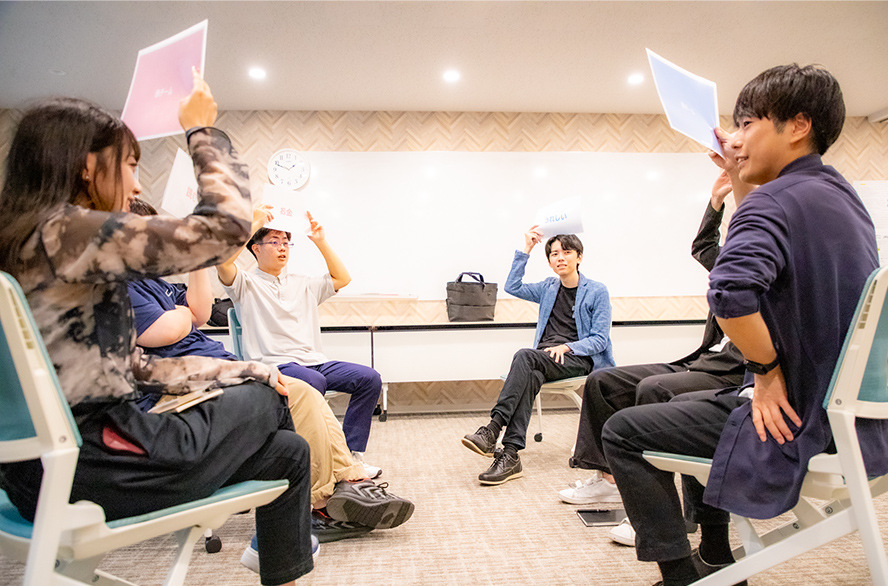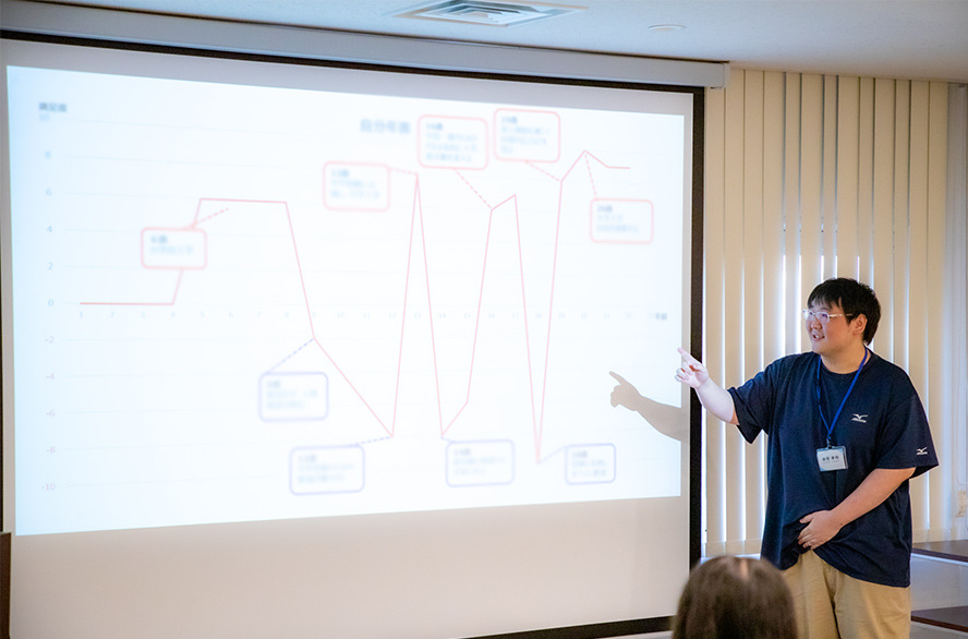昨年に引き続き、幼少期から現在までの経験をモチベーショングラフで表した、オリジナルの「人生年表」をつくって発表していただきました。巷で流行りの「性格(MBTI)診断」も活用。内定者6名の個性あふれる発表に、笑いが起こる場面が多くありました。