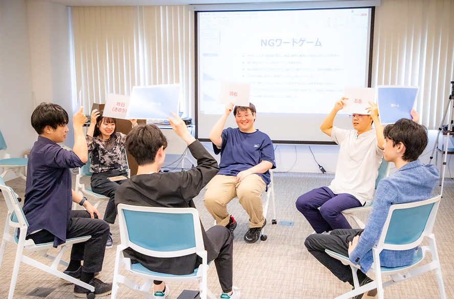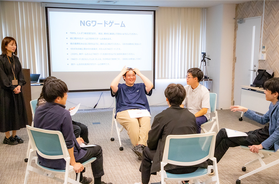 内定者の皆さんがオフィスに到着すると、人事より当日の流れについて案内があります。その後、「NGワードゲーム」を実施。同期同士の距離を少しでも縮められたらと思い、開式前にアイスブレイクの機会を設けました。