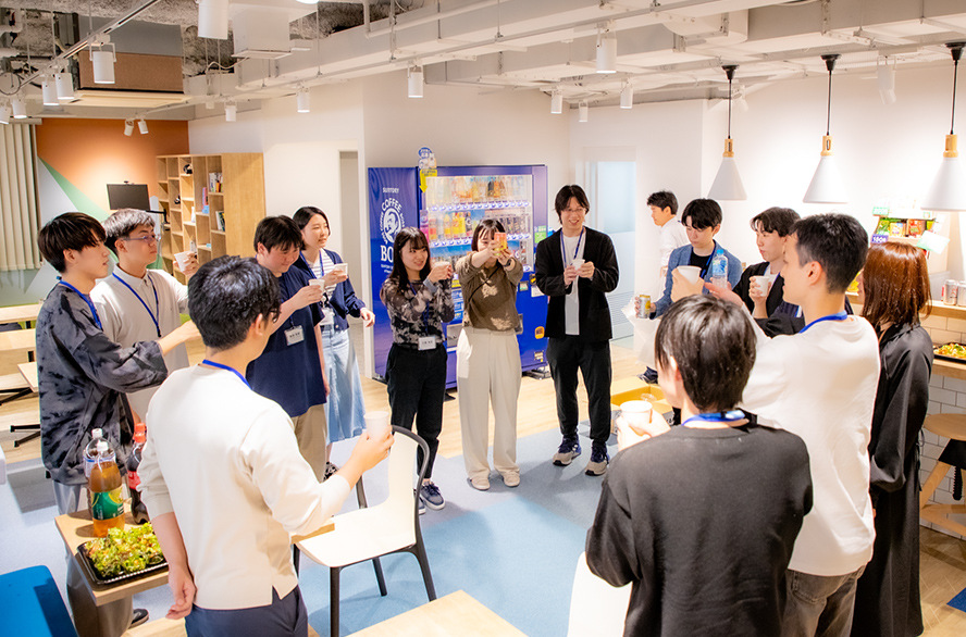 内定者も社員も一緒になって、みんなで乾杯。お疲れさまでした~!